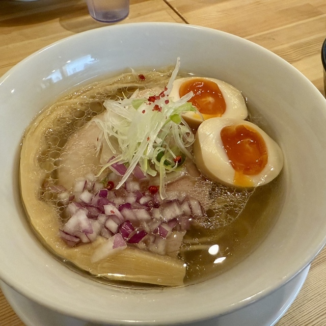 店内同様、綺麗な見た目のラーメンが出てきました。厨房内の明るい光源のせいか、スープの油がかなり煌めいてます。見た目に反して油強めのパンチ系か…??